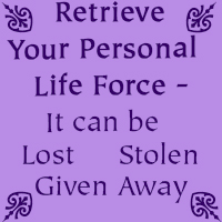 Personal Life Force can be lost when you experience traumatic events such as accidents, moving, surgery, or stressful experiences. It can also be given away to try and help someone. It can be stolen by “energy vampires” (e.g. someone who gets fun out of “scaring” people, who belittles someone, or who “dumps” their emotions on you and then “feels so much better.”) This powerful technique can retrieve that energy including energy lost in other lives. It is thus possible to retrieve more than the 100% with which you were born. When life force is low, it is difficult to achieve one’s goals or maintain health. When it gets too low, death follows.